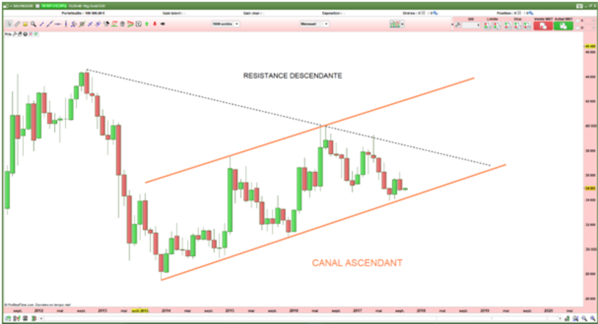 Suite à la dernière confrontation avec l’oblique descendante NOIRE, l’or a subi un nouveau tir de barrage. Cet accès de faiblesse a provoqué un retour sur le bas du canal ORANGE qui pour l’instant tient.